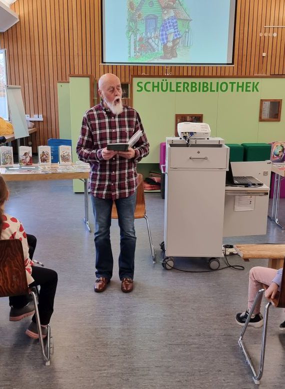 Herr Lambrecht las ausgewählte Geschichten seiner Bücher mit gekonntem Einsatz von Stimmmodulation, Gestik und Mimik vor und brachte die Kinder damit zum konzentrierten und interessierten Zuhören, aber auch zum Lachen, Staunen und Applaudieren.