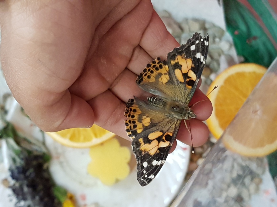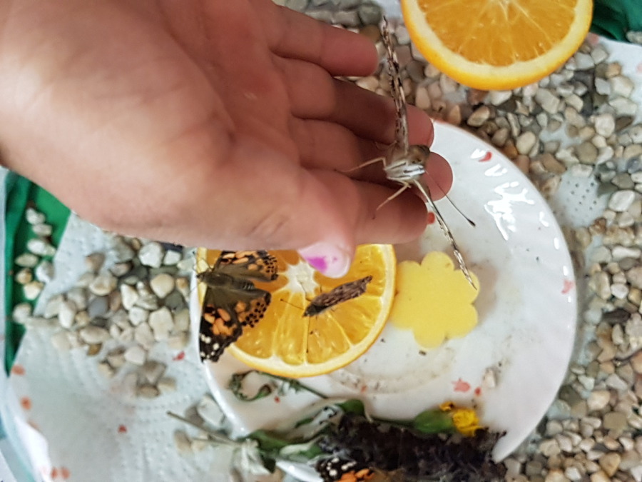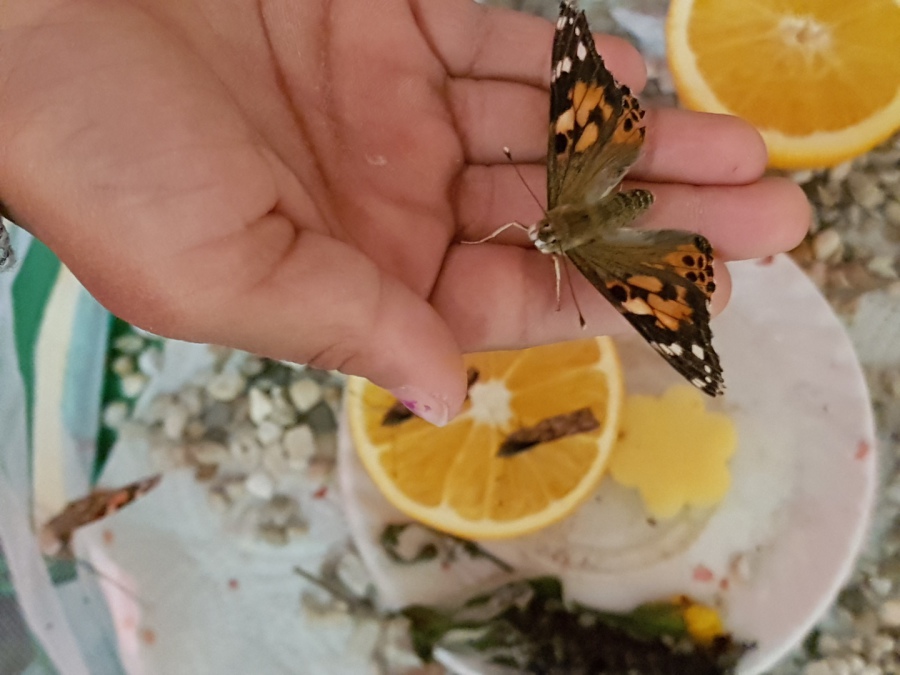 Das Betrachten der kleinen Insekten warf bei den Kindern viele Fragen auf und weckte großes Interesse. Dann endlich schlüpfte ein schöner Distelfalter nach dem anderen und begann seine Flügel aufzupumpen. Sehr gespannt beobachteten die Kinder wie ihre Schmetterlinge erste Flugversuche unternahmen und waren gerne bereit, ihnen Blüten und Orangen als Futter oder auch Kieselsteine und Blätter mitzubringen. Die Schüler/innen sahen fasziniert zu, wie die Schmetterlinge immer wieder ihre Saugrüssel ausrollten. Zusätzlich gab es eine Zuckerlösung als Futter für die Insekten. Nach drei Wochen verabschiedeten sich die Kinder schließlich von ihren Schmetterlingen und die Tiere wurden frei gelassen.
